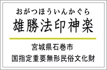 雄勝法印神楽は「浜神楽」に属し、その中でも、娯楽性と華麗さが加わった桃生神楽の典型的な芸風を踏襲し、しかも威厳のある風格が備わり、厳しい修法の香りが漂う独特の神楽だといわれています。 |