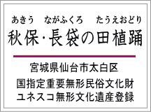 仙台市秋保町には長袋、湯元、馬場の3地区に田植踊りがあり、総称して「秋保の田植踊」といわれます。平家の落人(おちうど)がすみついたとされる長袋の田植踊りは褒め言葉の場面を得意としています。