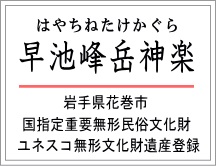 早池峰神楽は、大償(おおつぐない)地区と岳(たけ)地区の2つの神楽の総称です。