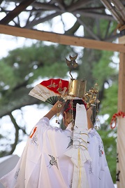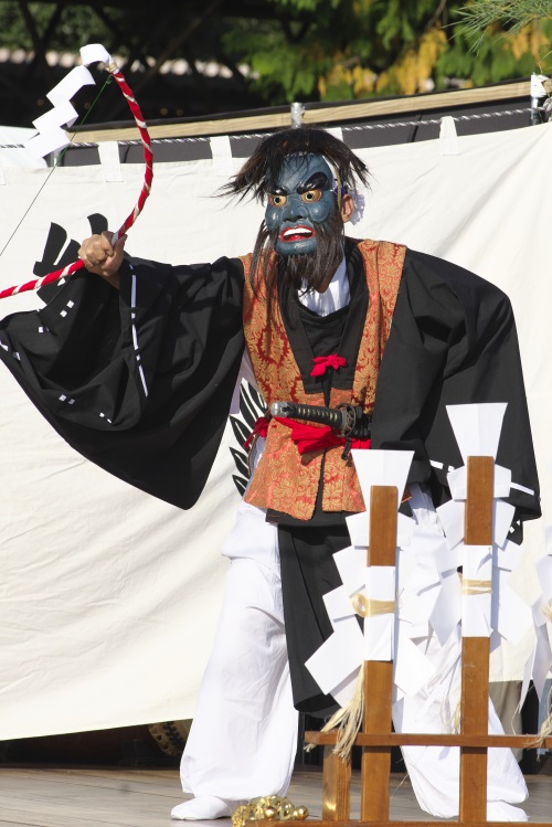 舞人の鎮魂除魔の足踏みなど、修験の呪法とされるしぐさが随所に織り込まれ、古来の神楽のあり方を引き継いでいます。 |