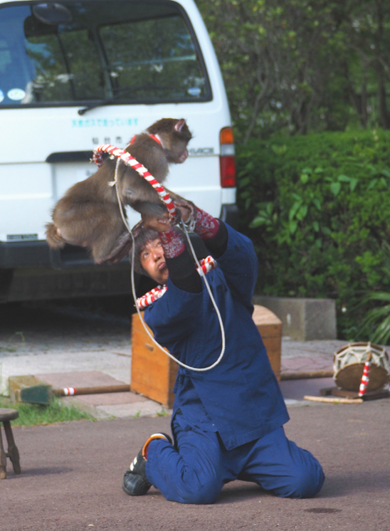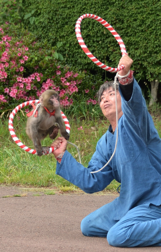 その後、昭和30年代に猿まわしの歴史は一度途絶えてしまいます。しかし、俳優の小沢昭一さん等の尽力により、昭和52年(1977)に「周防猿まわしの会」が結成され、翌昭和53年に猿まわしを復活させた中心人物のお一人が村崎修二さんです。その後修二さんは猿舞座を結成し、伝統的な「本仕込み」というお猿さんと日常生活を共にしながら芸を仕込む、最も難しいといわれる猿まわし芸能を行ってきました。