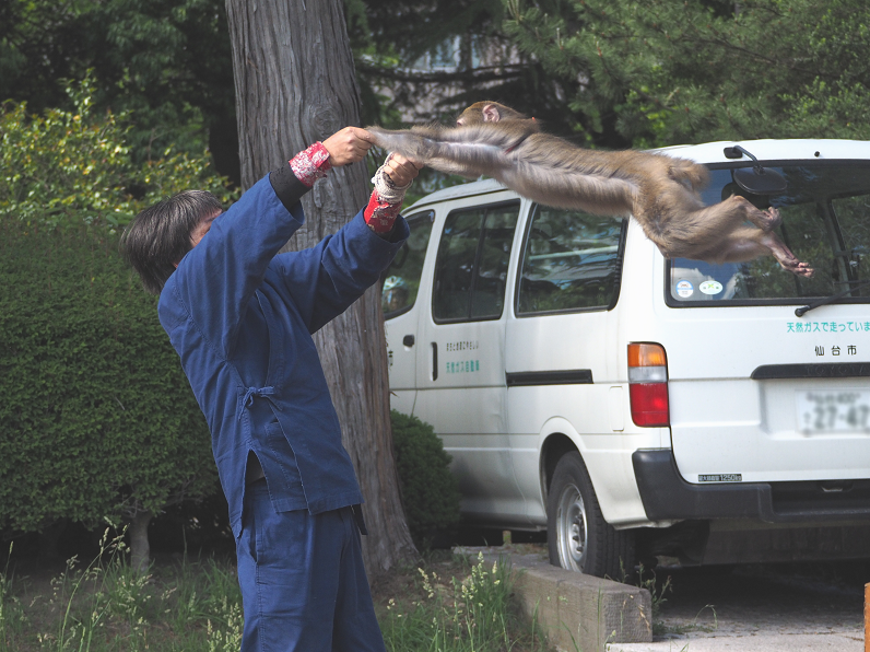 仙台と猿まわし芸能との関係は歴史が古く、江戸時代の仙台藩の猿まわしは猿引丁(現在の青葉区土樋)に山王神社を祀り、別当(僧侶)が城下の士屋敷などをまわったといわれます。また、明治以降になると山口県などの猿まわしが仙台を訪れるようになります。戦時中には一時中断しますが、昭和25年(1950)に猿引丁のあった土樋で20年ぶりに山口県の猿まわしが復活したと話題になり、その様子が河北新報に掲載されました。