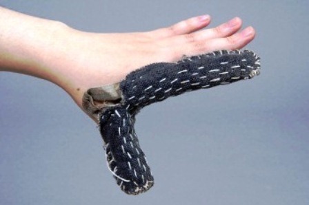 機械が入る以前の稲刈りは、人の手によって行われました。1日に何百回、何千回と素手で稲を刈るので、稲をつかむ親指と人差し指の間の皮が破れ、血がにじんできます。そこでテマタという保護具を、親指と人差し指の間にはめて稲刈りを行いました。