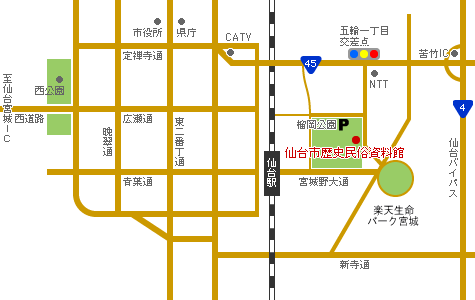 ![]() 【1】国道45号線から南に向かって進みます。 【2】宮城野中学校向かい側にあるゆるやかな坂道を直進し、歩道橋へ上ります。 【3】歩道橋で道路を渡り、歩道橋から下りてすぐ左手の階段を上り、榴岡公園へ入ります。 ※歩道橋を下りずそのまま直進してすぐ右手の階段からも公園へ入れます。 【5】目の前に見えてくる白い建物が当館です。 ※【5】は当館裏口側になります。反対側(公園芝生広場側)へ回り、正面入り口からご入館ください。 |